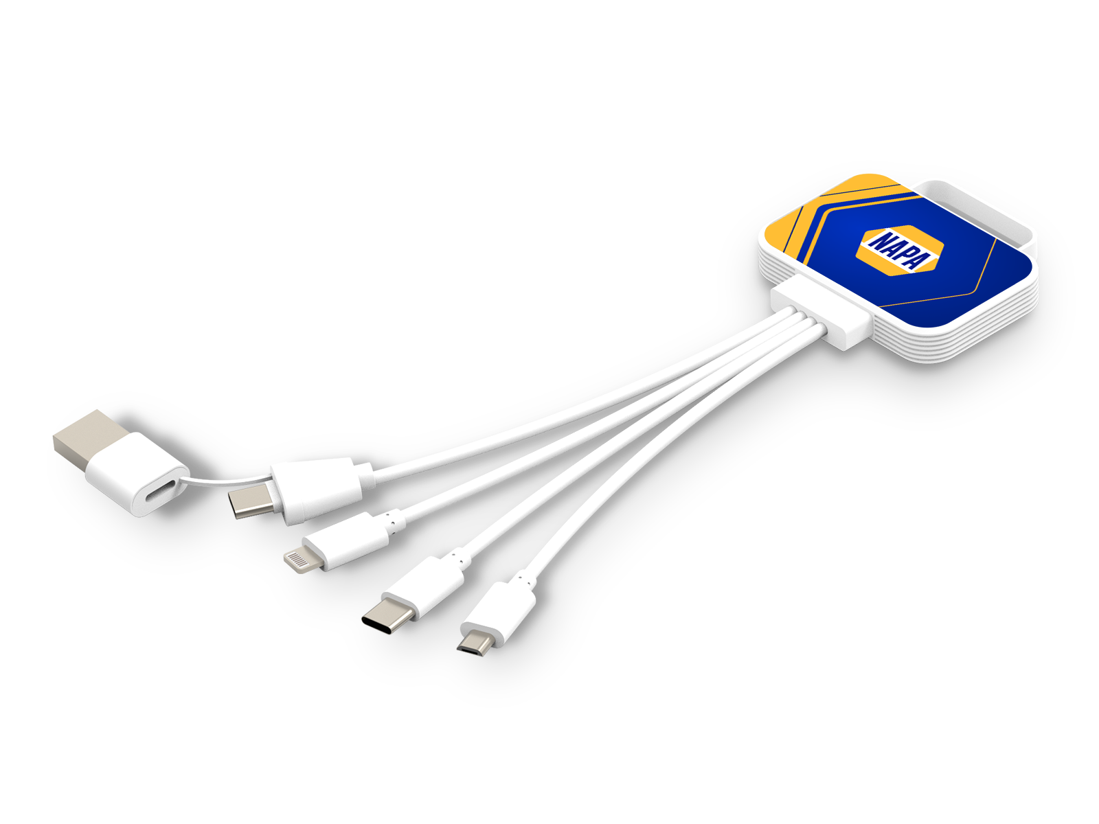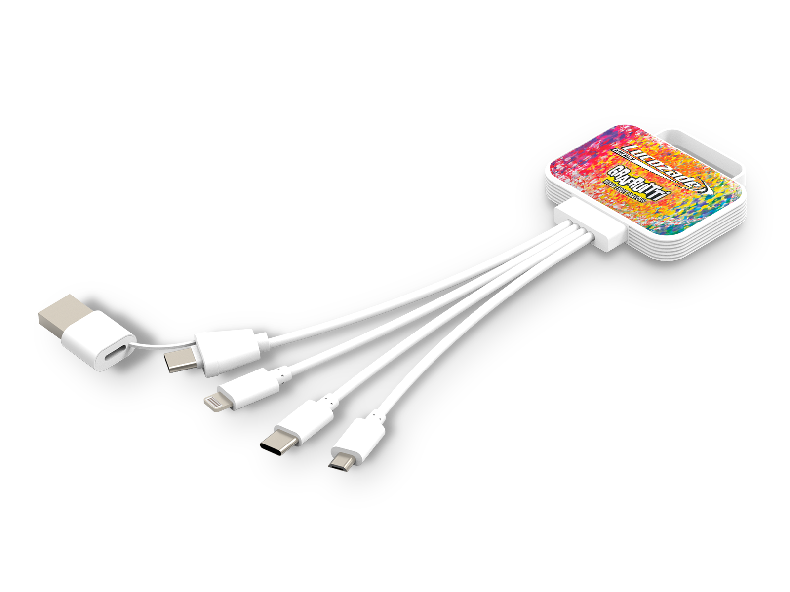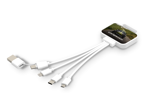 Stay powered with the Fresh Charging Cable. This charging cable comes with dual USB-A & Type-C input, a lightning port, a USB C port, and a micro-USB port, meaning that you can charge all your devices on the go. The cables come in a white colour. The cables are housed within a sturdy case, which can be flood branded in full colour.