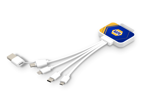 Stay powered with the Fresh Charging Cable. This charging cable comes with dual USB-A & Type-C input, a lightning port, a USB C port, and a micro-USB port, meaning that you can charge all your devices on the go. The cables come in a white colour. The cables are housed within a sturdy case, which can be flood branded in full colour.